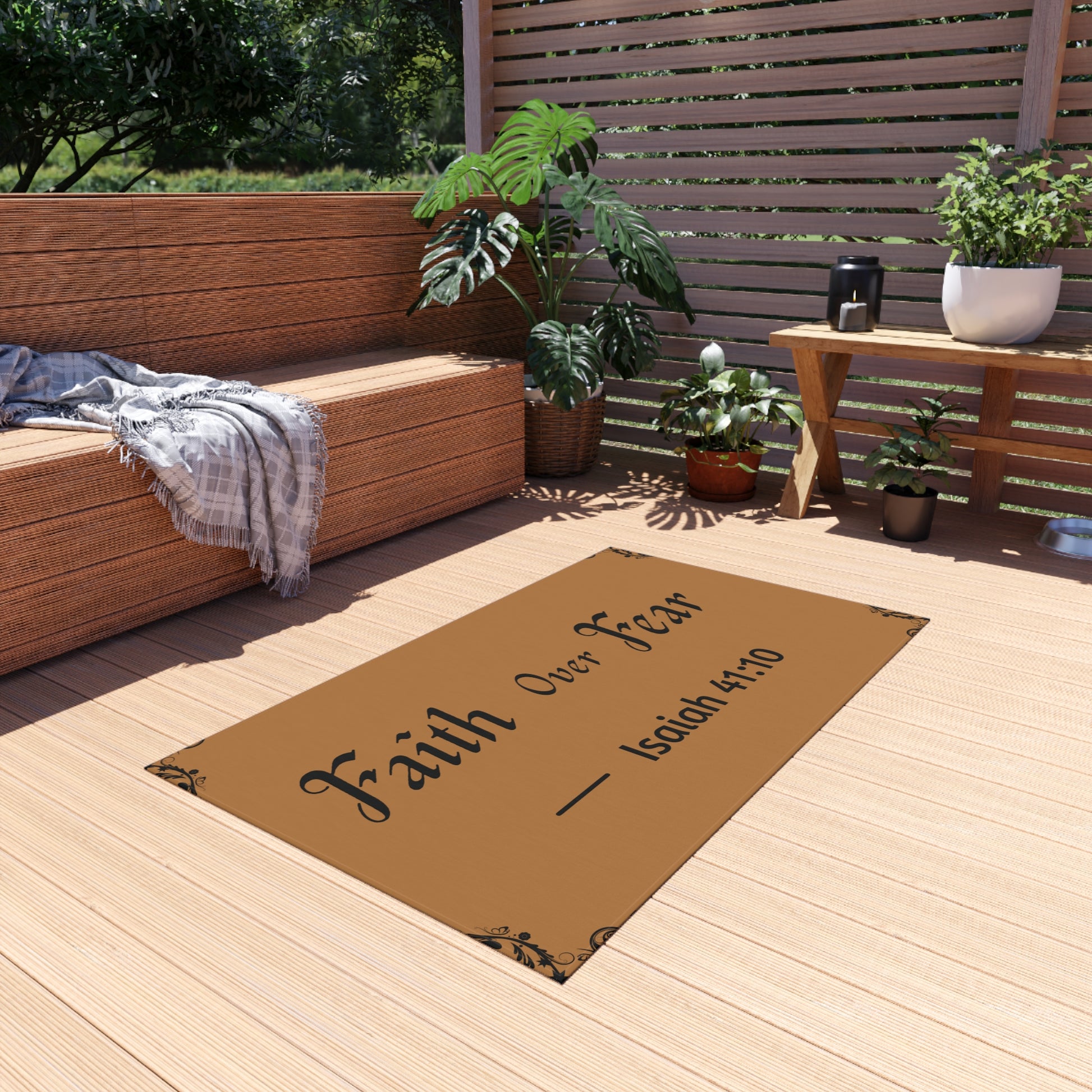A warm, faith-inspired outdoor rug that brings quiet confidence to your doorstep or patio. The rich, rustic brown field is printed with the uplifting phrase “Faith Over Fear” and the comforting scripture reference Isaiah 41:10, set in an elegant classic type with subtle corner flourishes. The plush polyester chenille surface invites bare feet and morning coffee, while the non-skid backing keeps the rug steady on porch boards or stone. It adds a calm, grounding presence to porches, entryways, and outdoor seating areas—welcoming guests with a gentle reminder to choose courage and trust.